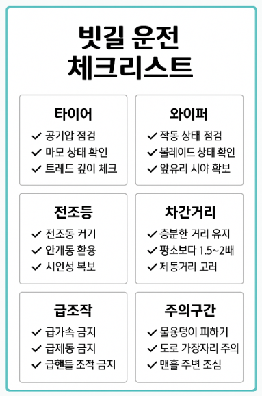 A1. 가장 먼저 타이어 상태와 와이퍼 기능을 확인하세요. 이 두 가지는 빗길 안전의 핵심입니다.