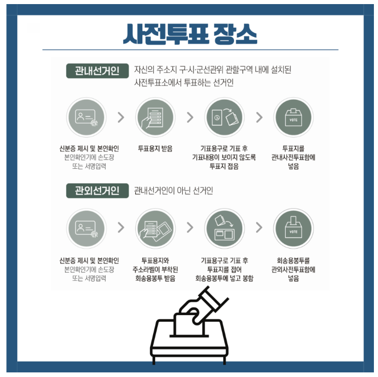 본투표가 어려우신 분들은 사전투표일에 꼭 참여하셔서 민주주의에 함께하세요.