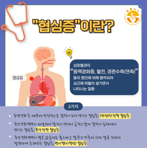 협심증은 심장 근육이 혈액을 충분히 공급받지 못해 발생하는 일시적인 가슴 통증을 의미합니다. 이는 주로 동맥경화로 인한 혈관 협착, 또는 혈관 수축으로 인해 발생합니다.