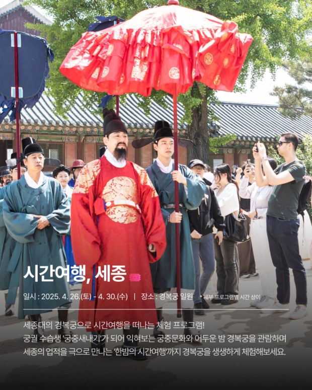대부분의 입장은 무료! 하지만 ‘시간여행, 세종’, ‘고궁음악회’, ‘야간 투어’ 같은 일부 프로그램은 사전 예약 또는 유료예요. 1인당 요금은 프로그램에 따라 다르지만 보통 3,000원~5,000원 선이에요. 문화비로는 가성비 최고 아닐까요?